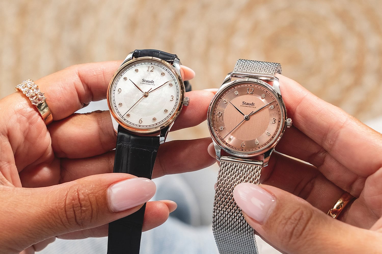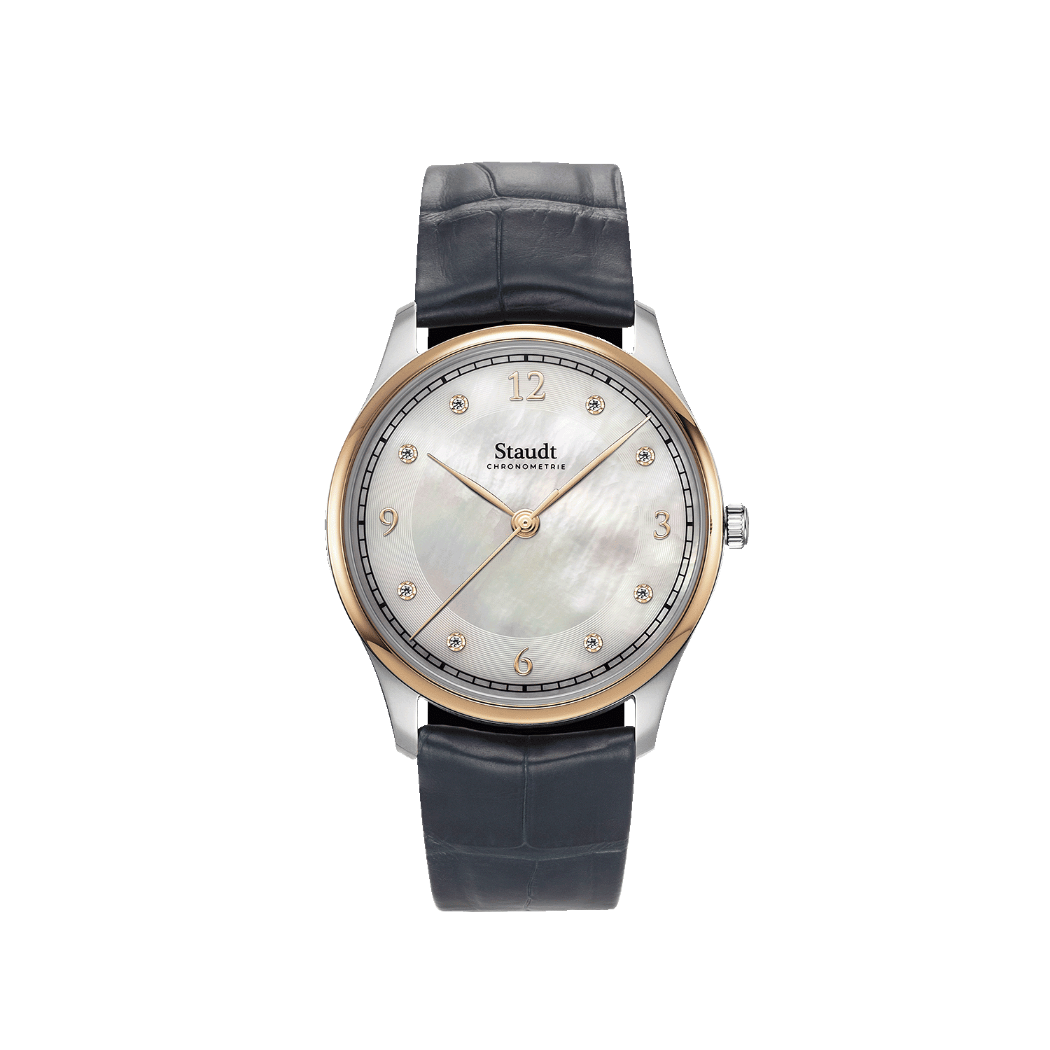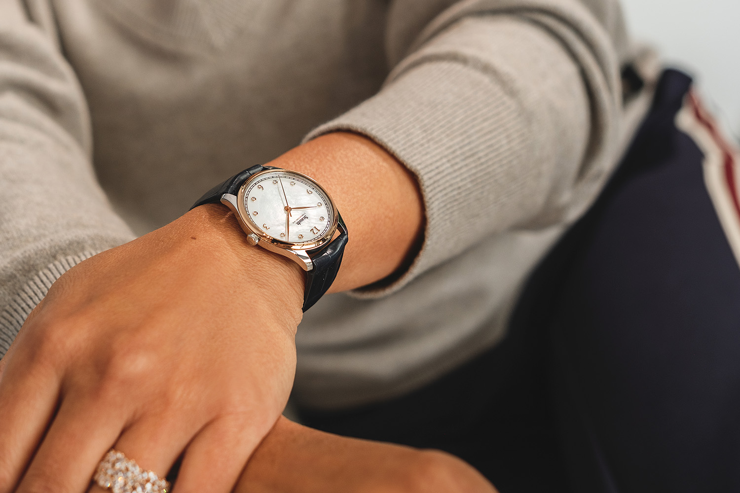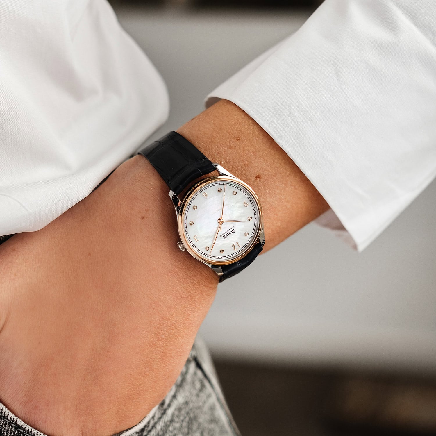 Elegante Finesse. Die Kurven der Prelude Petite Plus sind unaufdringlich und raffiniert. Da das Seitenprofil in einer Kurve gestaltet ist, trägt sich die Uhr besonders schlank. Das tief polierte Uhrengehäuse ist aus Edelstahl mit einer massiven Lünette aus 18kt Roségold. Im Inneren tickt ein zuverlässiger Schweizer Qualitätszeitmesser.