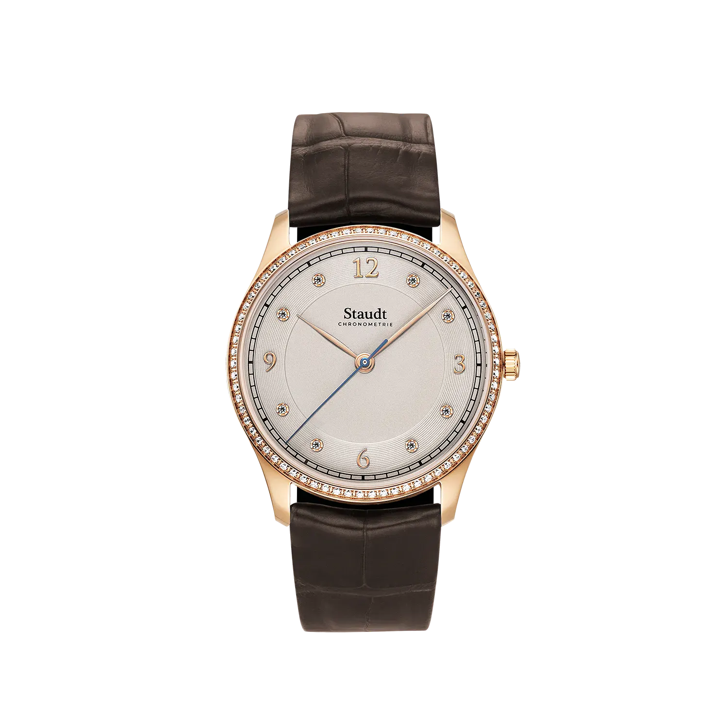Prelude Petite Plus. A ladies' watch that exudes timeless elegance: slim in shape, understated in appearance, but rich in detail. The subtly matt sand-coloured dial is given a warm glow by the sparkle of natural diamonds and the solid 18-carat rose gold watch case. Personalise the dial and wear a piece that is entirely yours.